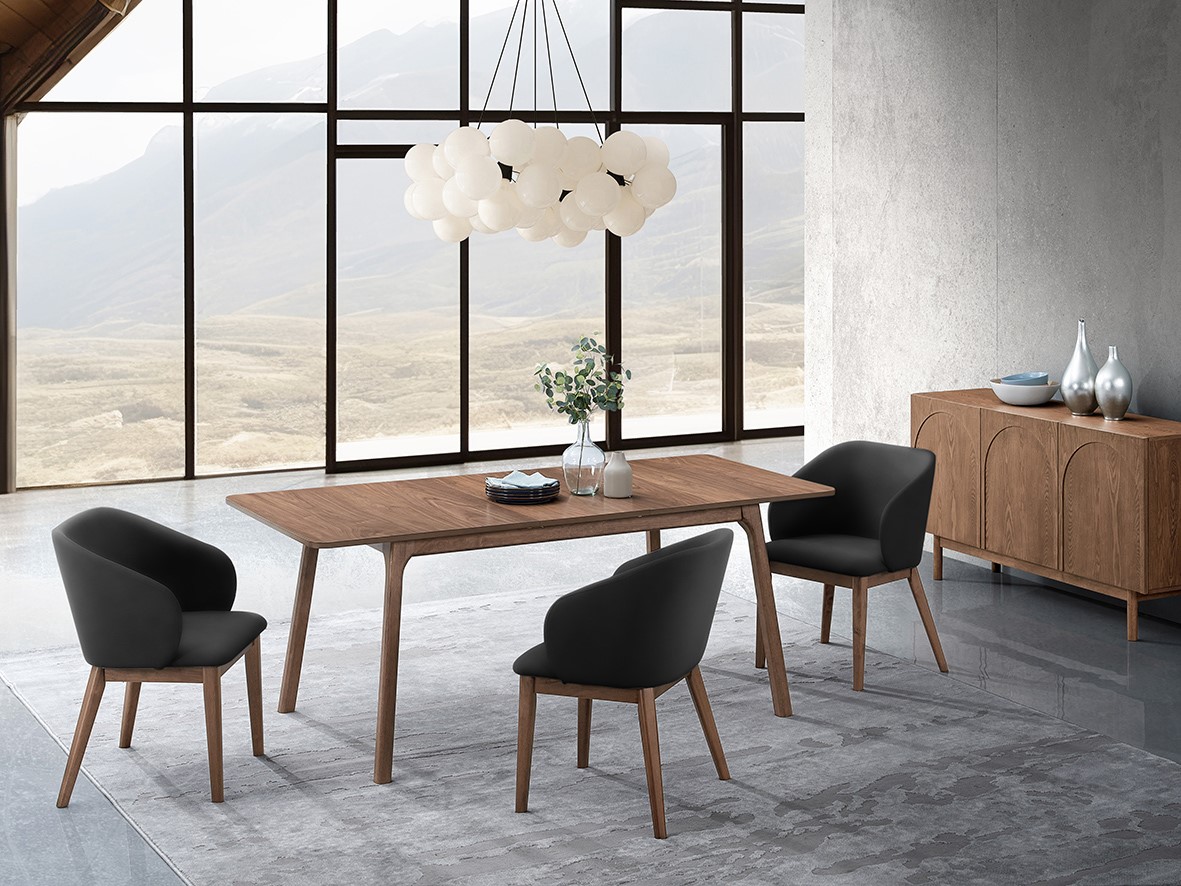 table a dîner rowen avec extension de 16 ¨walnut , chaise rowen tissu pu noir , bois couleur walnut